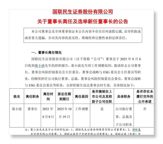在券商行业格局不断演变的关键时期,国联民生证券于8月8日晚间发布重磅公告,公司高层人事迎来重大调整。原董事长葛小波因工作调整辞去董事长等职务,仍留任执行董事与总裁;公司党委书记、董事顾伟正式当选为董事长,与此同时,熊雷鸣、郑亮、胡又文等来自民生证券且经验丰富的高管也获新聘任,这标志着国联民生证券整合步入全新阶段,也预示着公司未来发展将迎来新契机。