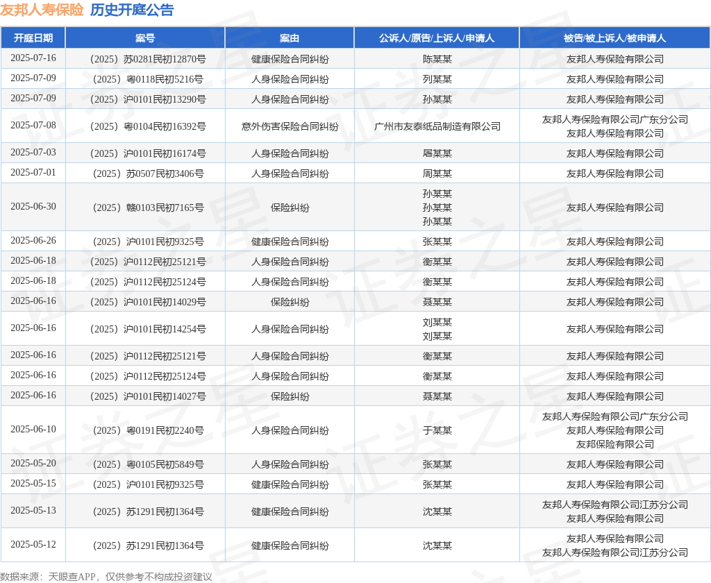 本站消息,根据天眼查APP显示,近日公布了一则友邦人寿保险有限公司作为被告/被上诉人的开庭公告,详细内容如下:
